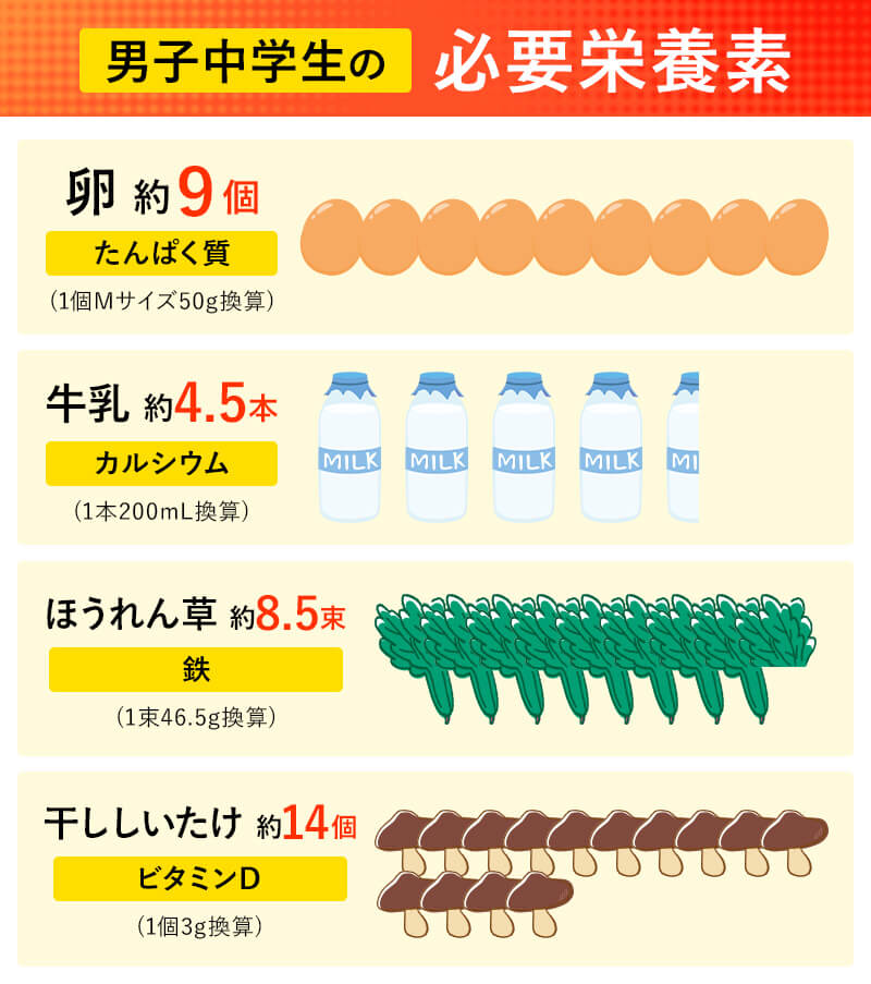 中学生の必要栄養素を食べ物に換算すると、